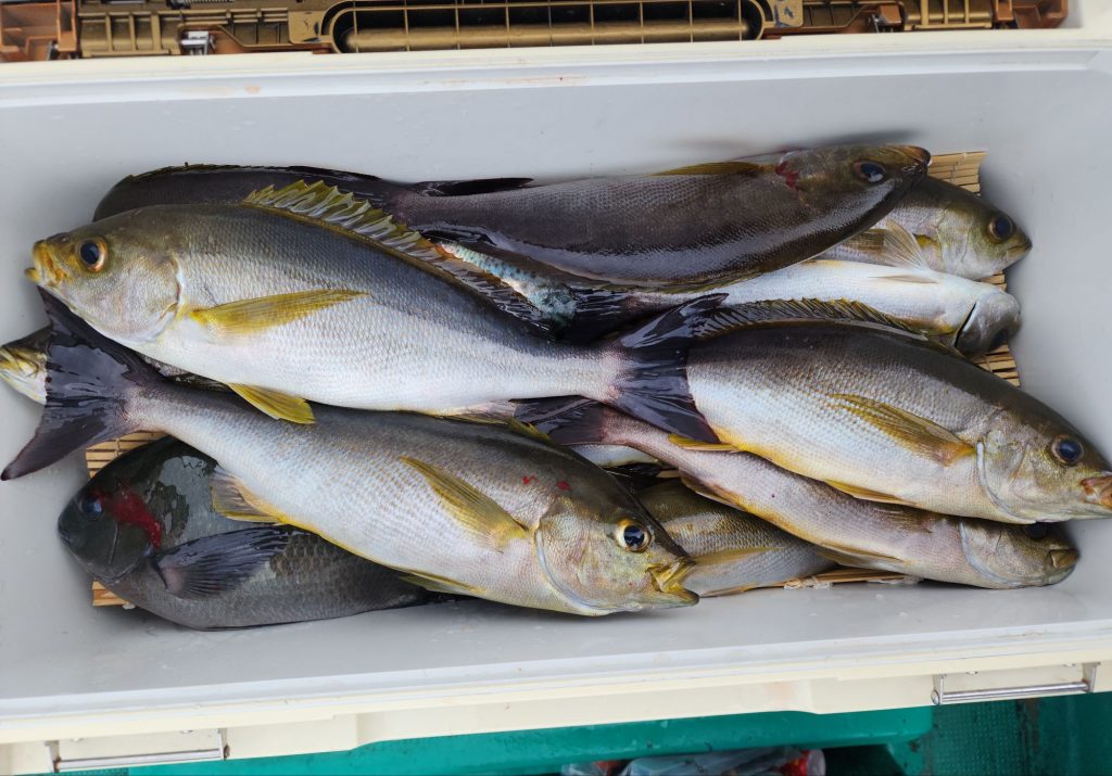 田久保さん(旦那) はイサギとグレを水面で逃げられ、、、イサギ3尾です❗(◎-◎;)